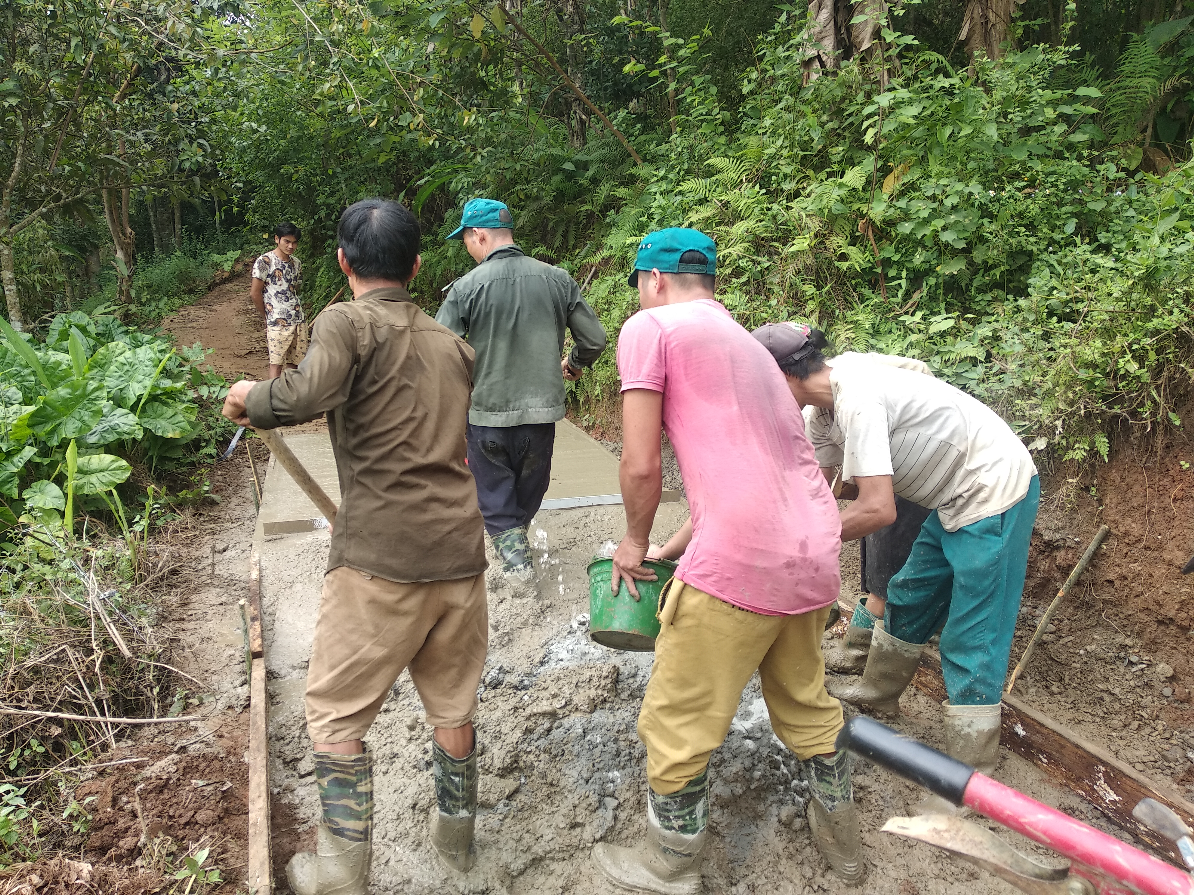(Nhân dân thôn Nậm Chuầy hăng hái đổ bê tông tuyến đường Nông thôn Mới)