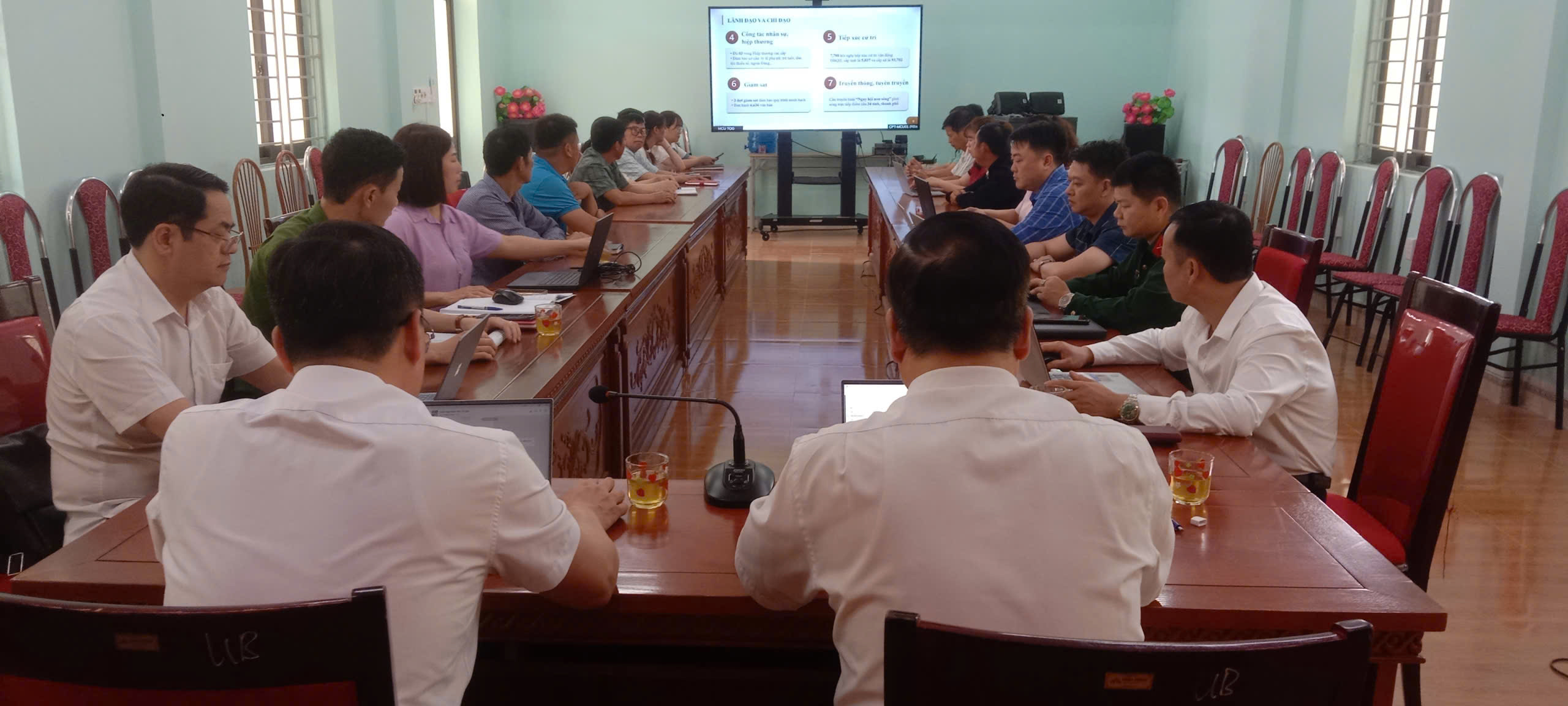 Các đại biểu tham dự Hội nghị toàn quốc tổng kết công tác bầu cử đại biểu Quốc hội khóa XVI và Đại biểu Hội đồng nhân dân các cấp nhiệm kỳ 2026 – 2031 tại điểm cầu xã Niêm Sơn.